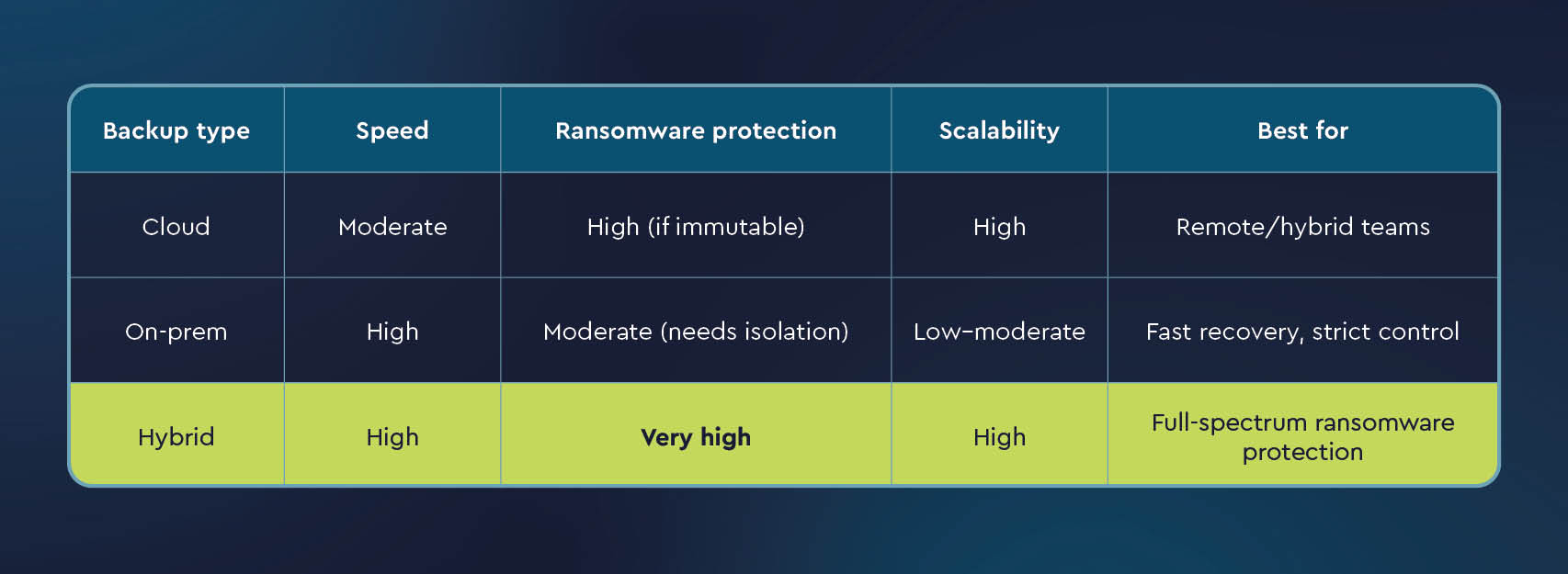 • Ransomware backup options include on-premises, cloud, or hybrid: Choosing between these solutions requires balancing speed, security, and recoverability.